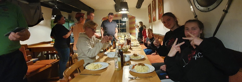 Schnell waren die Zimmer verteilt und dem gemeinsamen Geländespiel und dem Erkunden der näheren Umgebung stand nichts mehr im Wege. Selbst der einsetzende Regen konnte die Stimmung nicht trüben, die Stunden vergingen im Flug. Der Einbruch der Dämmerung verlagerte dann die Aktivitäten zurück ins Haus. Mehrere „Zweierteams“ halfen bei der Zubereitung des Nachtmahls. Spaghetti mit Tomaten/Hackfleischsoße stand auf dem Speisezettel.