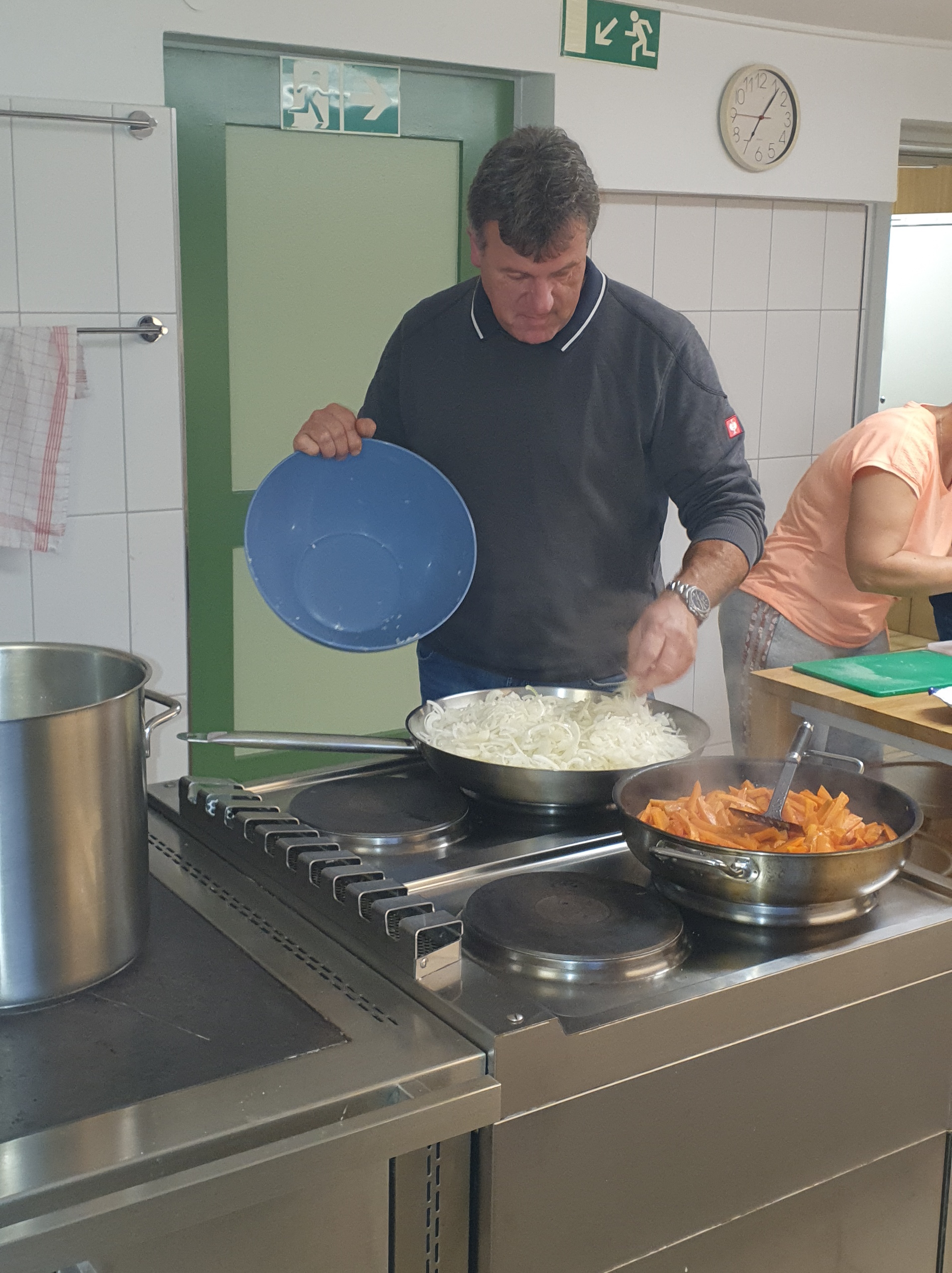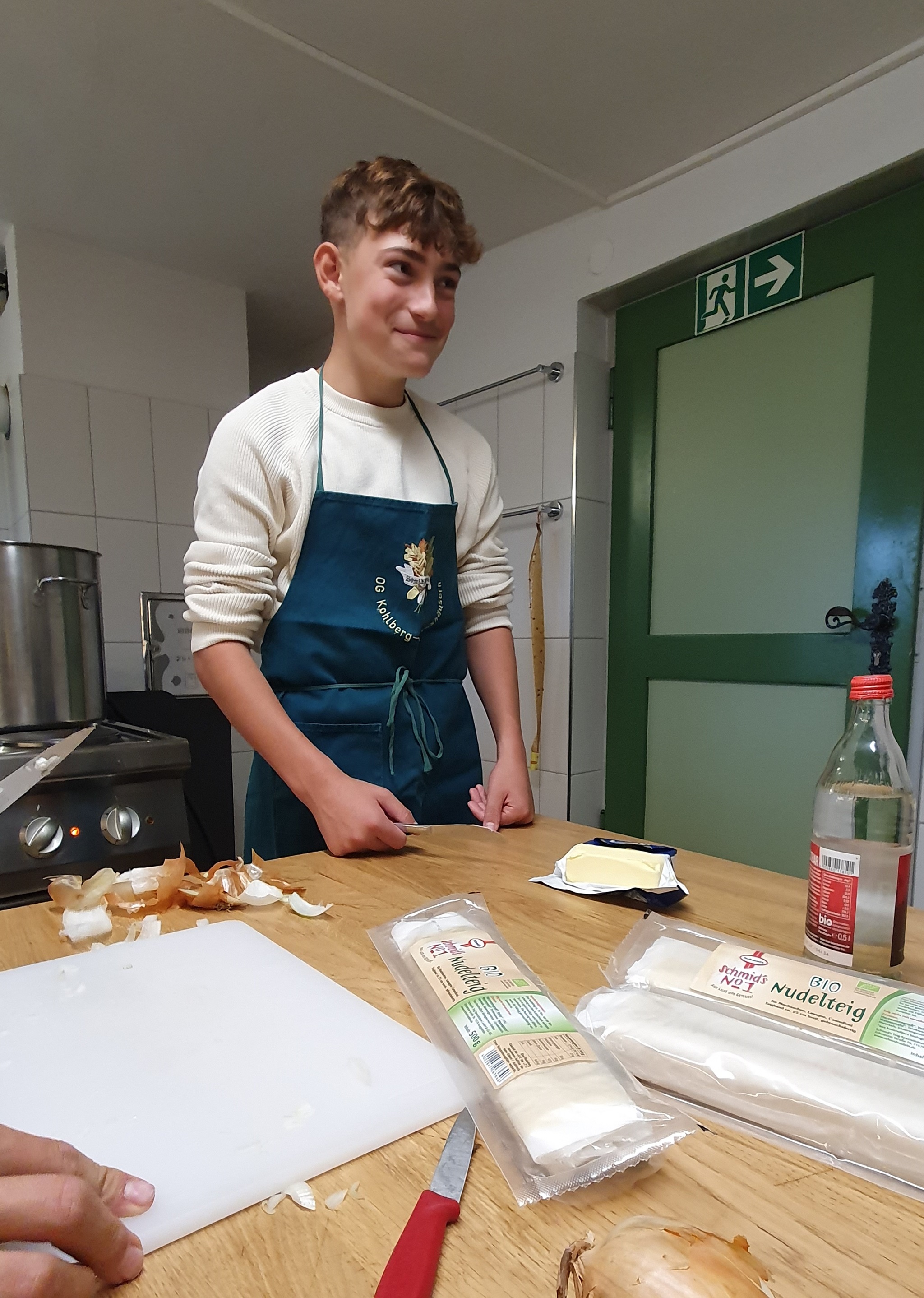 Kochen gehört seit Jahren zu den Highlights unserer Freizeiten. Für den ersten Abend stand schwäbische Hausmannskost auf dem Plan: Maultaschen mit Kartoffelsalat. Dank des großen Holzofens in der hervorragend ausgestatteten Burgküche waren die Kartoffeln im Nu gar und handwarm geschält – die unverzichtbare Basis für echten schwäbischen Kartoffelsalat. Nebenbei wurde geschnippelt, püriert und geknetet, bis die Füllung der Maultaschen fertig war. Der Teig war ausgerollt, wurde gefüllt und eingerollt. Kurz ins kochende Wasser, ein paar Minuten warten – und schon lagen die ersten Maultaschen auf dem Abtropfblech. Natürlich musste sofort verkostet werden. Das Urteil des Küchenteams fiel eindeutig aus: „Beste Qualität – freigegeben!“ Selbst der Wunsch nach einer vegetarischen Variante wurde locker gemeistert.
