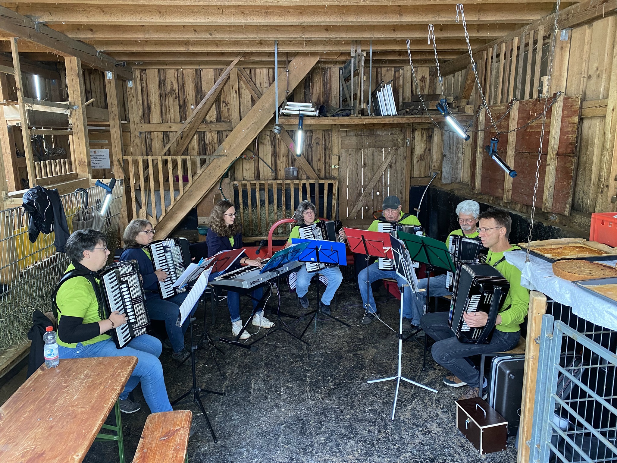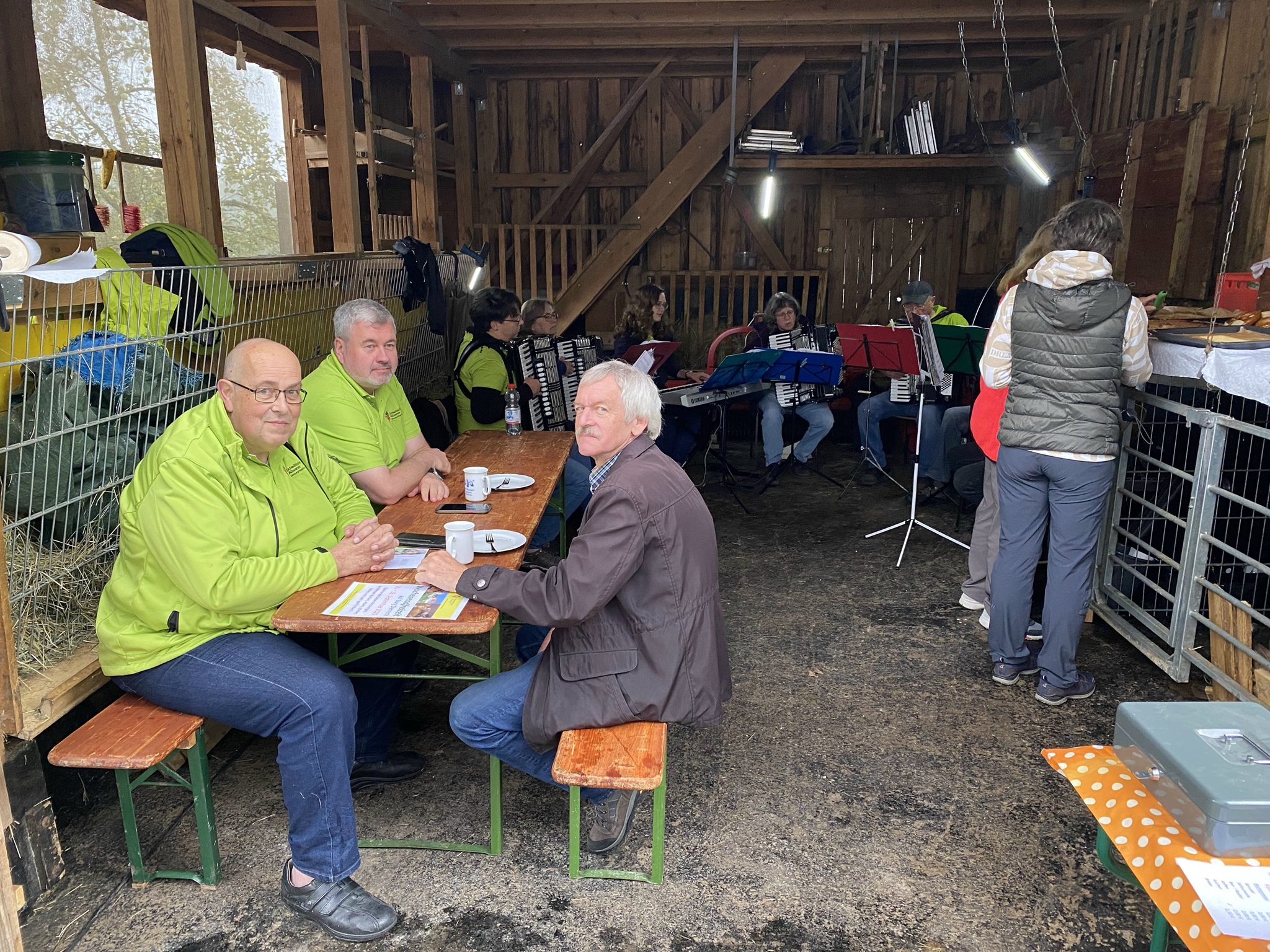 Das Akkordeonensemble fand Unterschlupf im Ziegenstall – dort war auch das reichhaltige Buffet mit Kuchen und Brezeln aufgebaut. Für unsere Gäste hatten wir Pavillons aufgestellt, sodass sich trotz des Wetters immer mehr Besucher einfanden, um der schwungvollen Musik der „Stallmusikanten“ zu lauschen. Und dann geschah, womit niemand mehr gerechnet hatte: Gegen 16.30 Uhr brach die Sonne durch die Wolken und sorgte für strahlende Gesichter. Das Kuchenbuffet war bald leer, die Brezeln aufgegessen und der Kaffee restlos ausgetrunken.