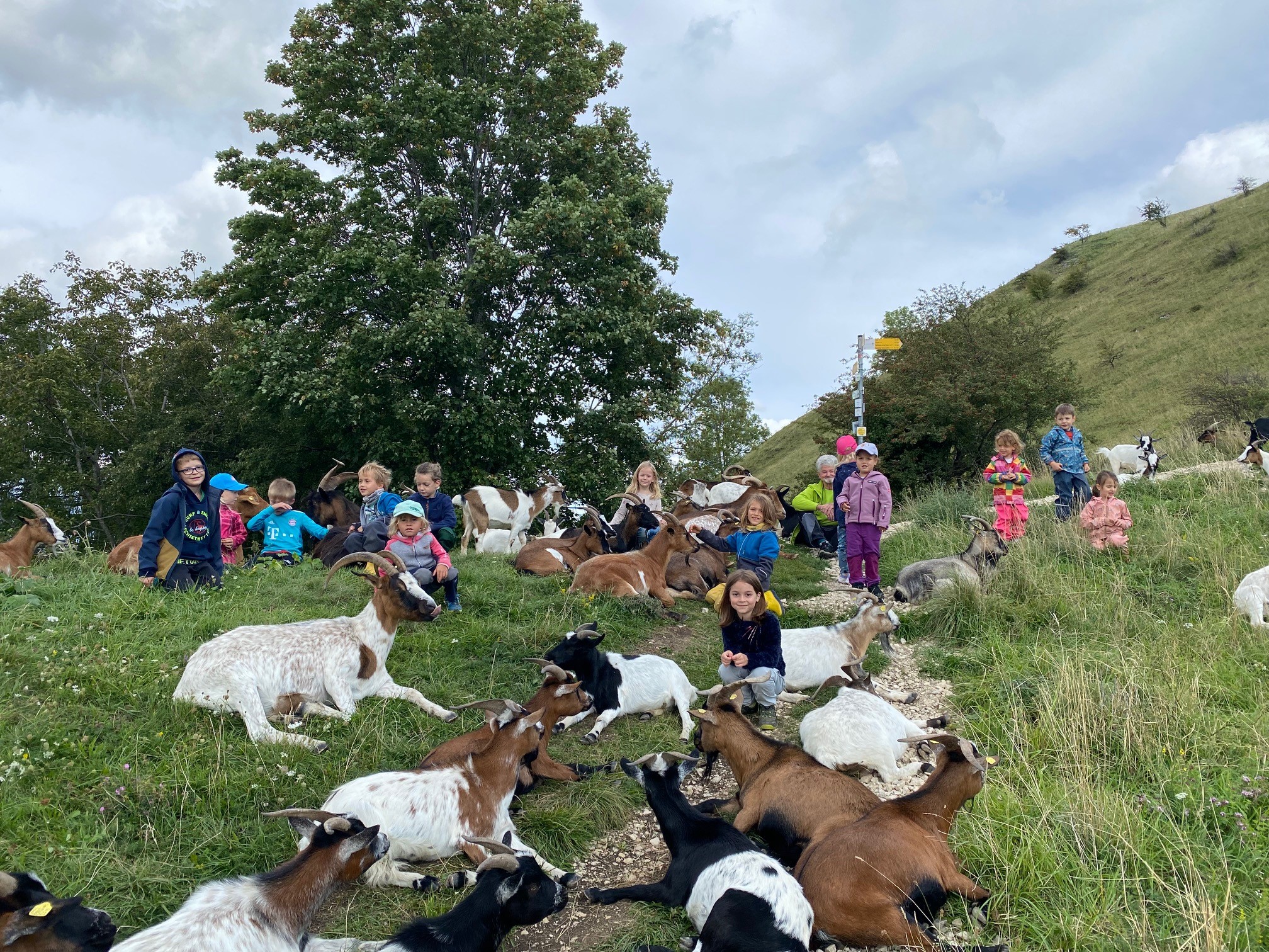 14 gut gelaunte Mädchen und Jungs versammelten sich am Freitag auf den Schulhof, um gemeinsam einen Nachmittag bei den Ziegen des Schwäbischen Albvereins zu verbringen.