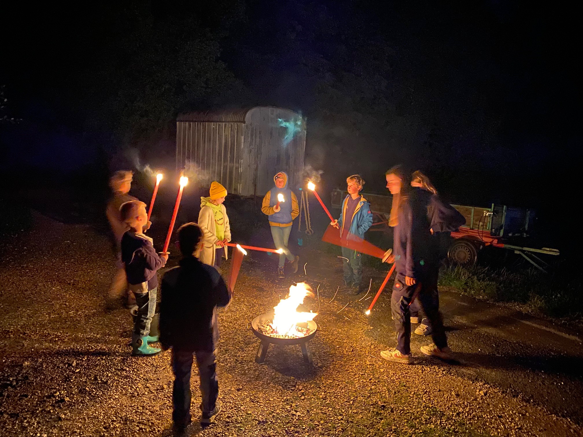 Es wurde gespielt, getobt und im Rahmen der FreitagsRoten gevespert. Als man „endlich“ unter sich war, wurde Feuer gemacht und die knisternde Wärme genossen. Nach Einbruch der Dunkelheit kamen die Fackeln zum Einsatz und eine eine Runde durch den finstern Wald gedreht.